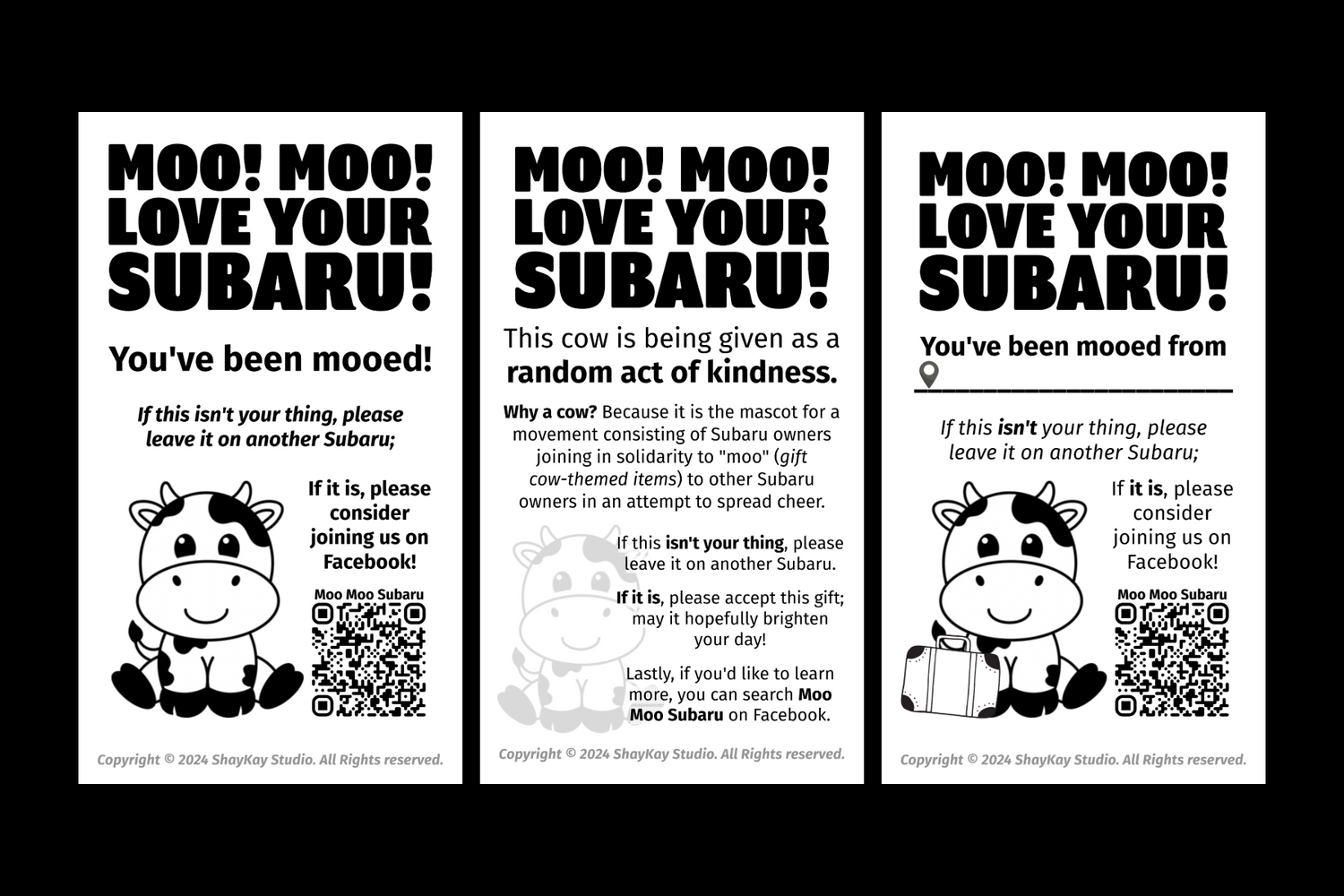 At ShayKay Studio, we’re honored to support the members of the Moo Moo Subaru community! That’s why we offer free, downloadable cards you can print right at home; perfect for those building their own moo-tastic kits!
