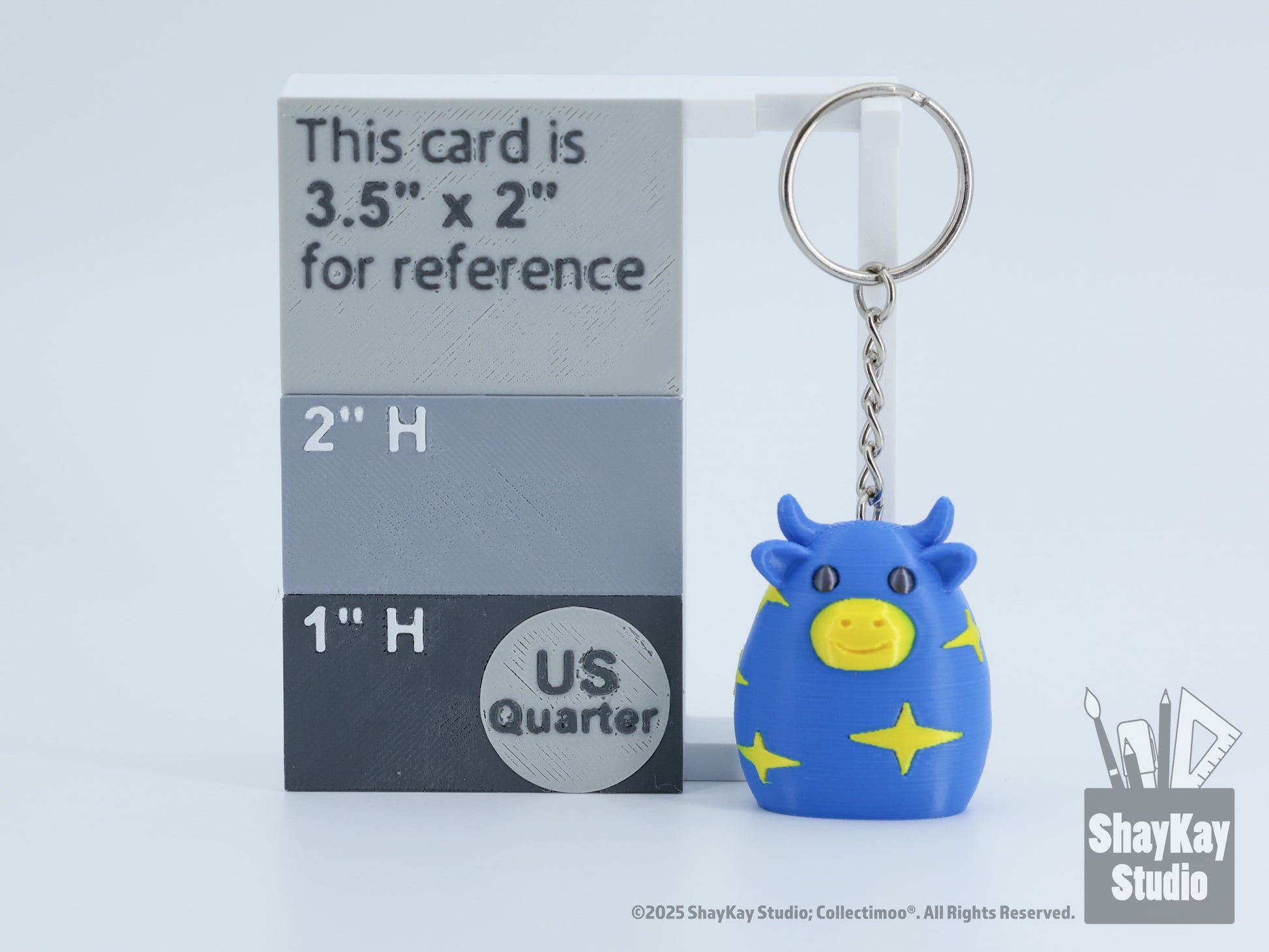 Our Moos measure ~1.58" tall whereas Micro Moos measure 1" tall; both can be ordered as pre-made keychains. What's more, some Micros also are able to be ordered as magnets (aka MOOnetics!)