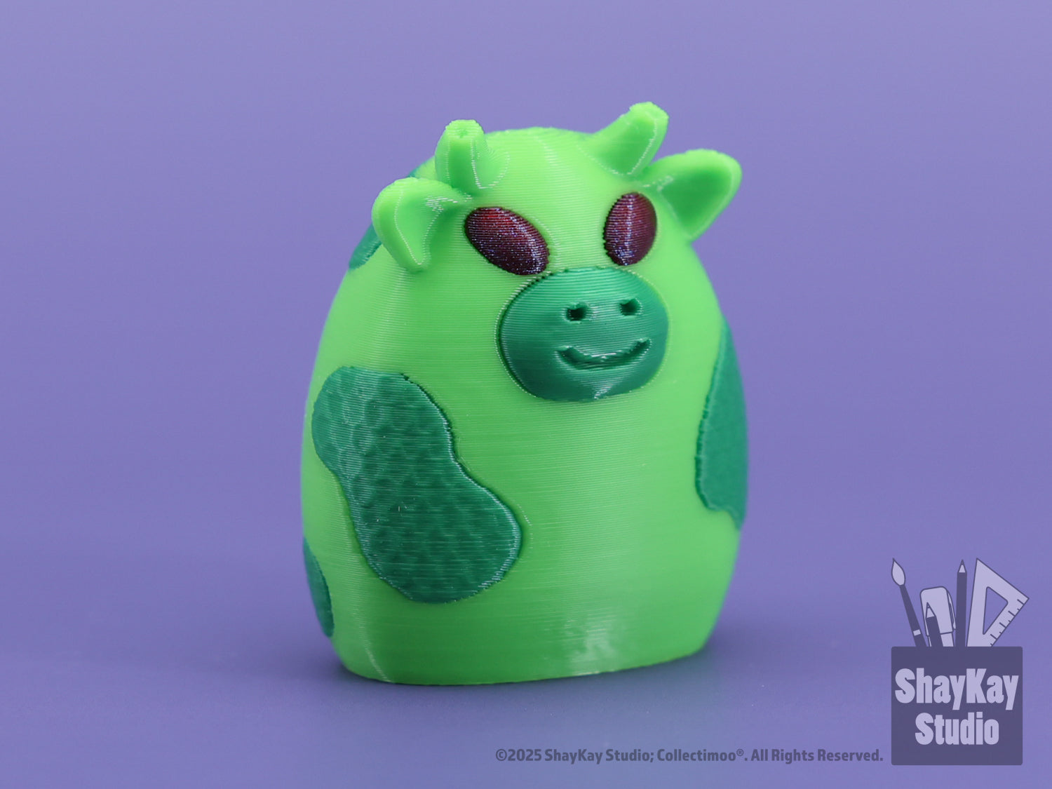 Straight from the MOO-niverse, meet the Alien Moo—our otherworldly visitor with textured spots, two wiggly tails, and big curious eyes that seem ready to beam up smiles! With its glowing green charm, this little extraterrestrial cow proves that kindness truly knows no bounds—not even galaxies.