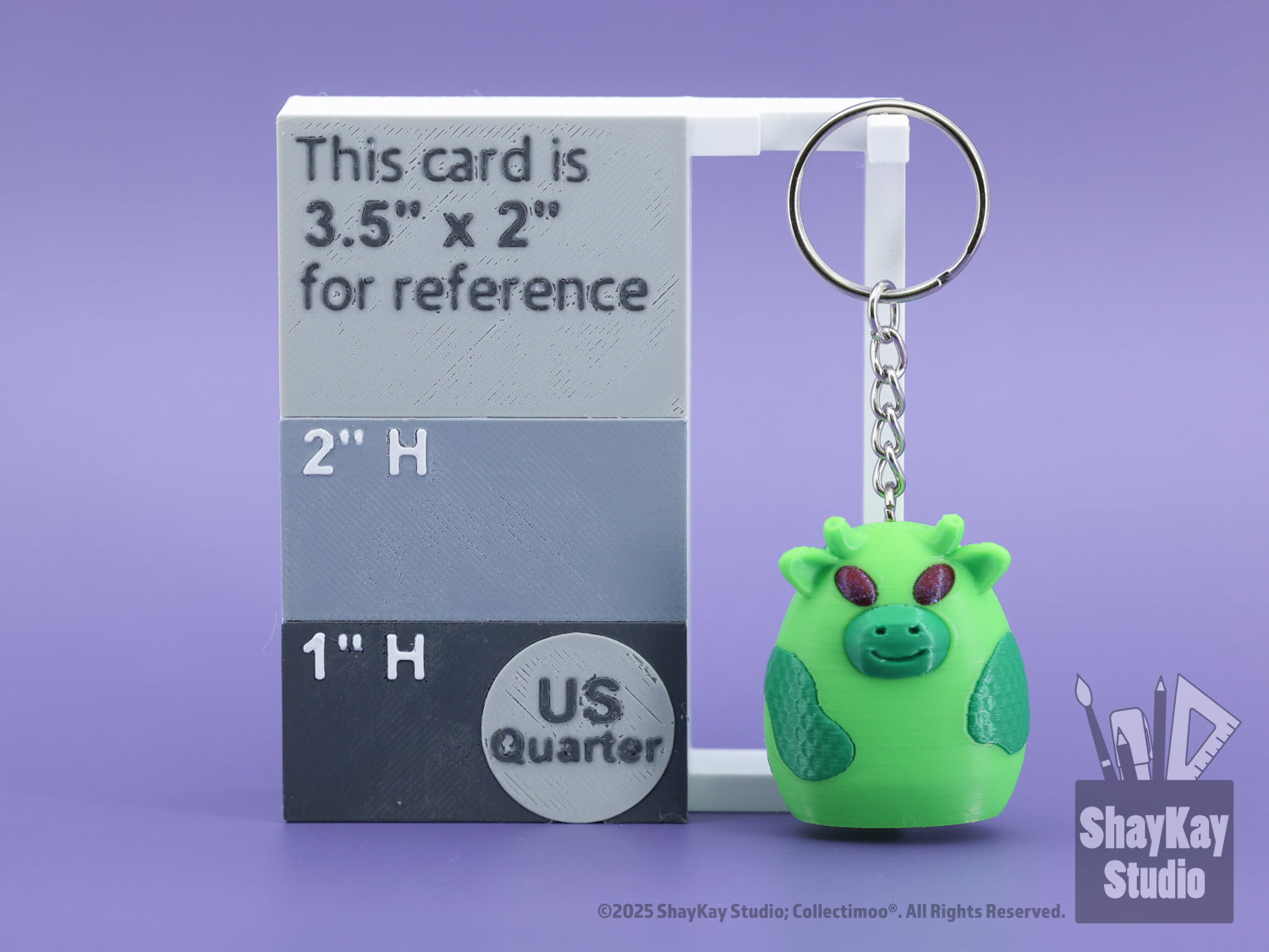 Our Moos measure ~1.58" tall whereas Micro Moos measure 1" tall; both can be ordered as pre-made keychains. What's more, some Micros also are able to be ordered as magnets (aka MOOnetics!)