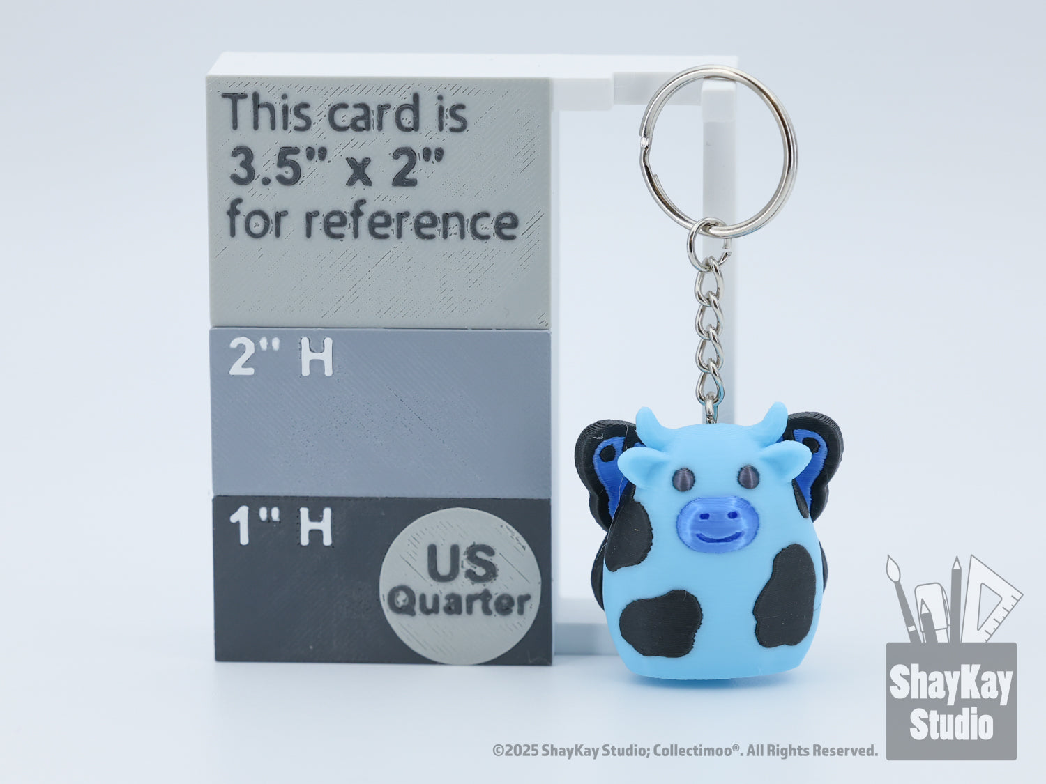 Our Moos measure ~1.58" tall whereas Micro Moos measure 1" tall; both can be ordered as pre-made keychains. What's more, some Micros also are able to be ordered as magnets (aka MOOnetics!)