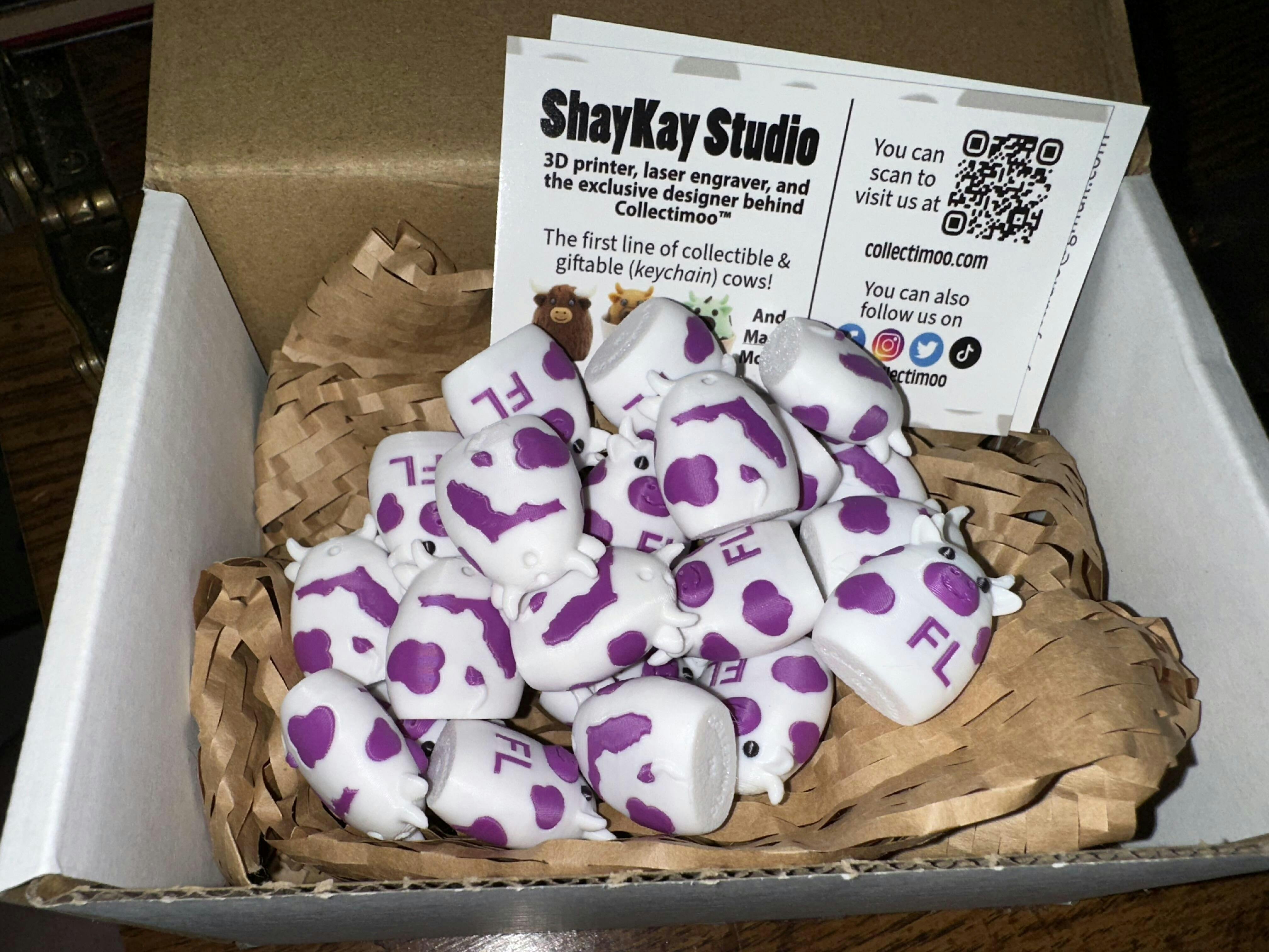 Our Moos measure ~1.58" tall whereas Micro Moos measure 1" tall; both can be ordered as pre-made keychains. What's more, some Micros also are able to be ordered as magnets (aka MOOnetics!)