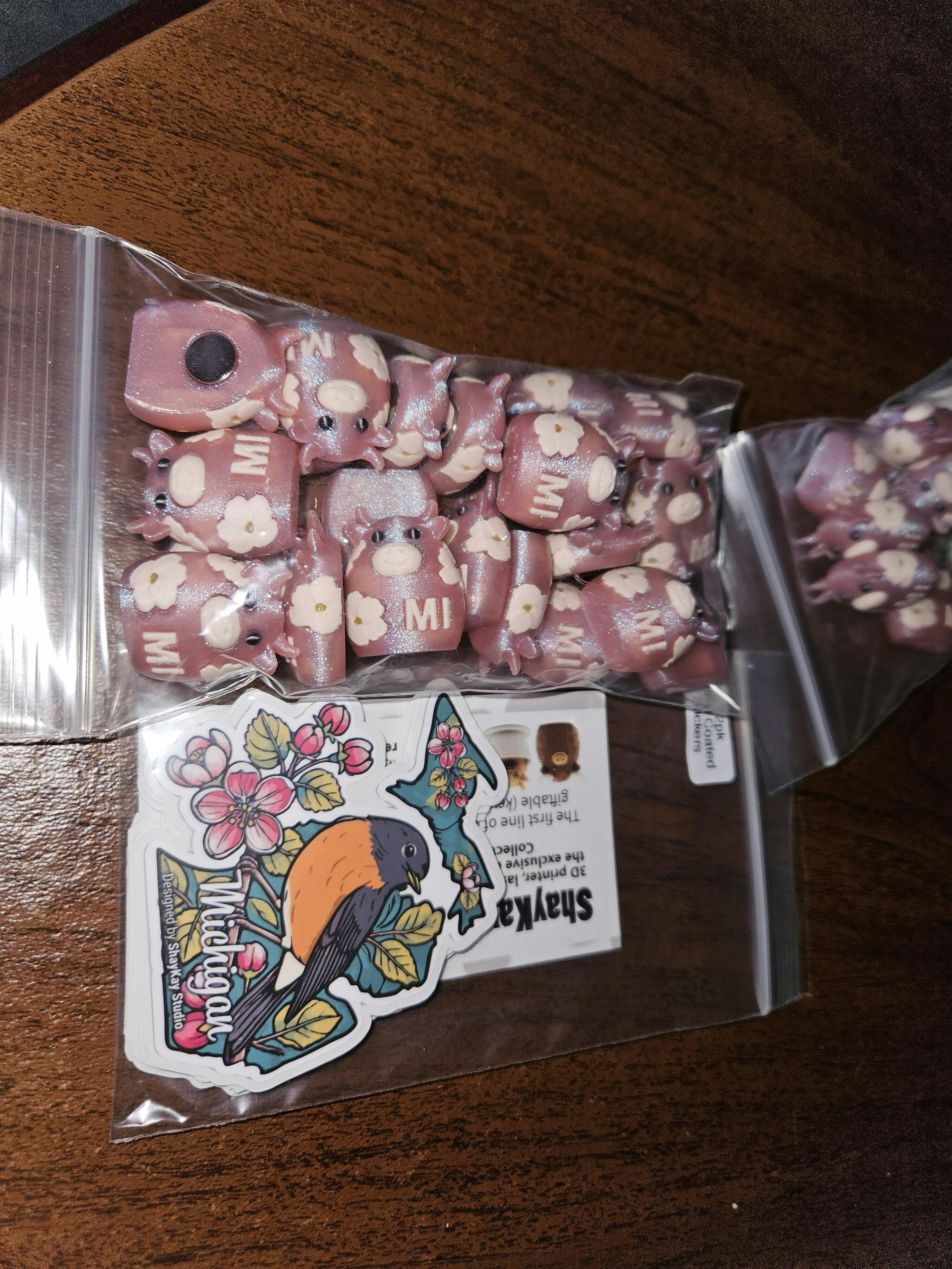 Our Moos measure ~1.58" tall whereas Micro Moos measure 1" tall; both can be ordered as pre-made keychains. What's more, some Micros also are able to be ordered as magnets (aka MOOnetics!)