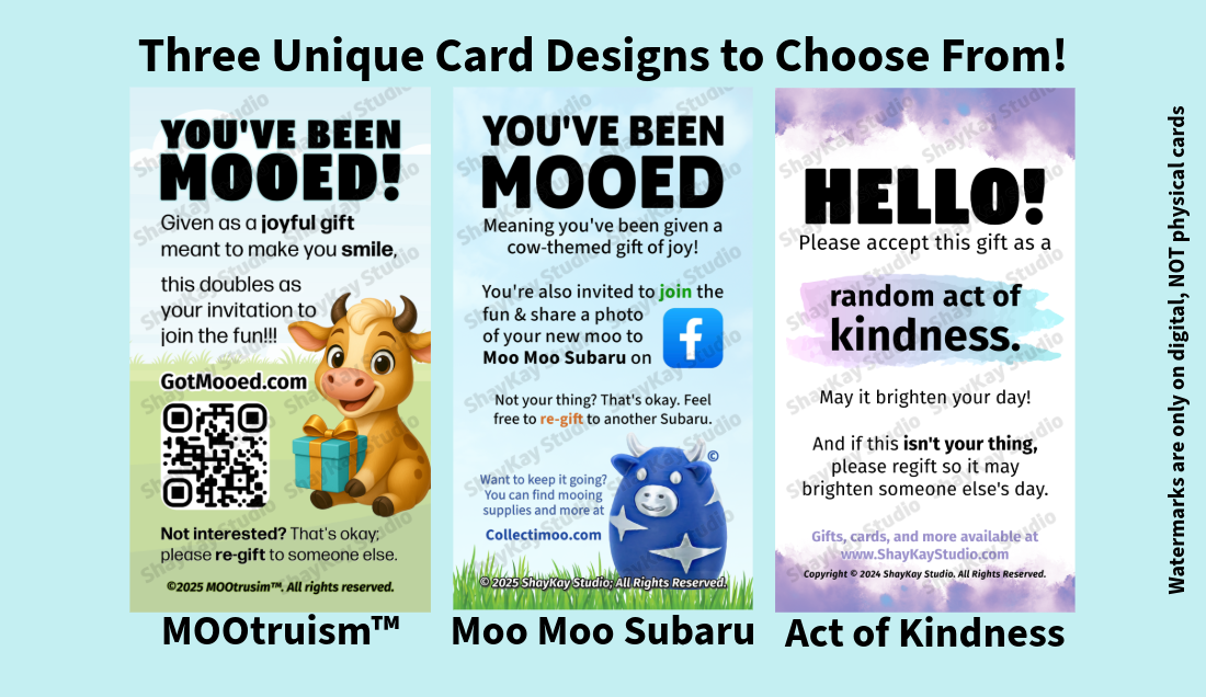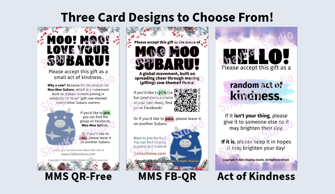 You can choose between one of three single-sided cards, all designs to support both the Moo Moo Subaru (MMS) (aka MOObaru) movement as well as the Random Acts of Kindness movement!!!