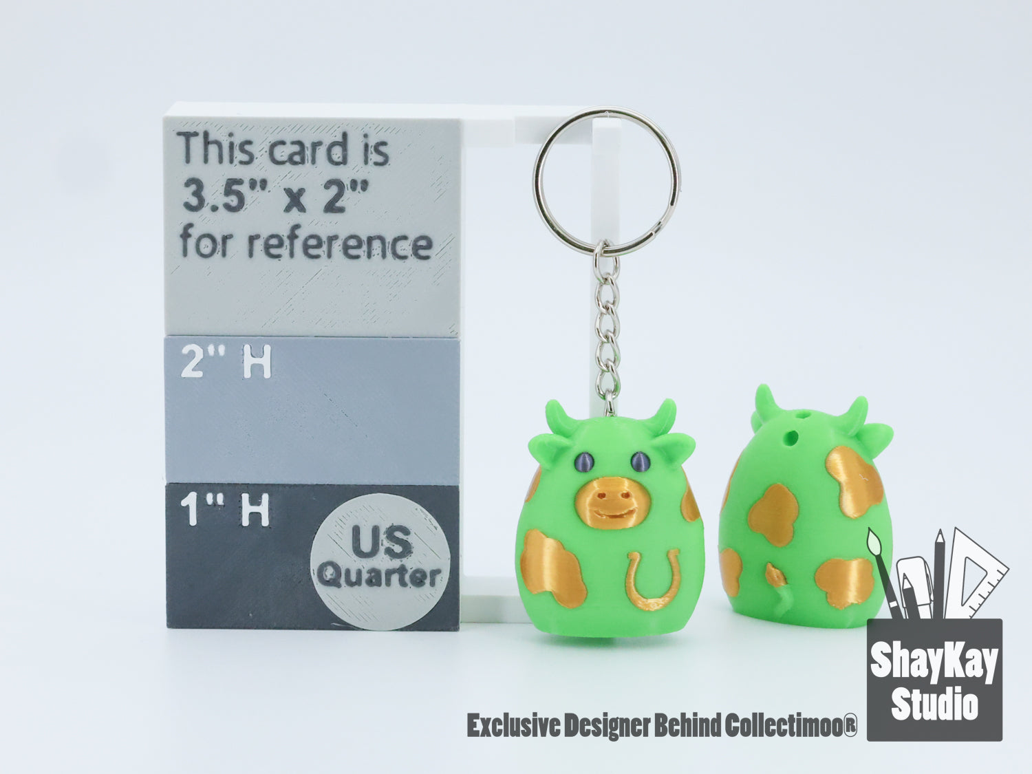 Our Moos measure ~1.58" tall whereas Micro Moos measure 1" tall; both can be ordered as pre-made keychains. What's more, some Micros also are able to be ordered as magnets (aka MOOnetics!)