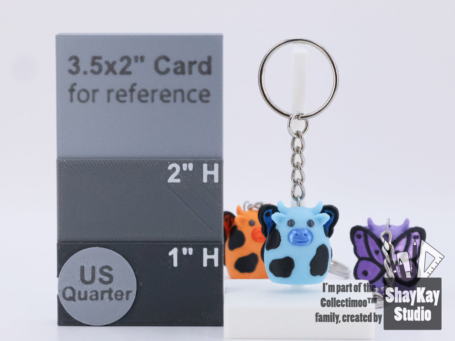Our Moos measure ~1.58" tall whereas Micro Moos measure 1" tall; both can be ordered as pre-made keychains. What's more, some Micros also are able to be ordered as magnets (aka MOOnetics!)