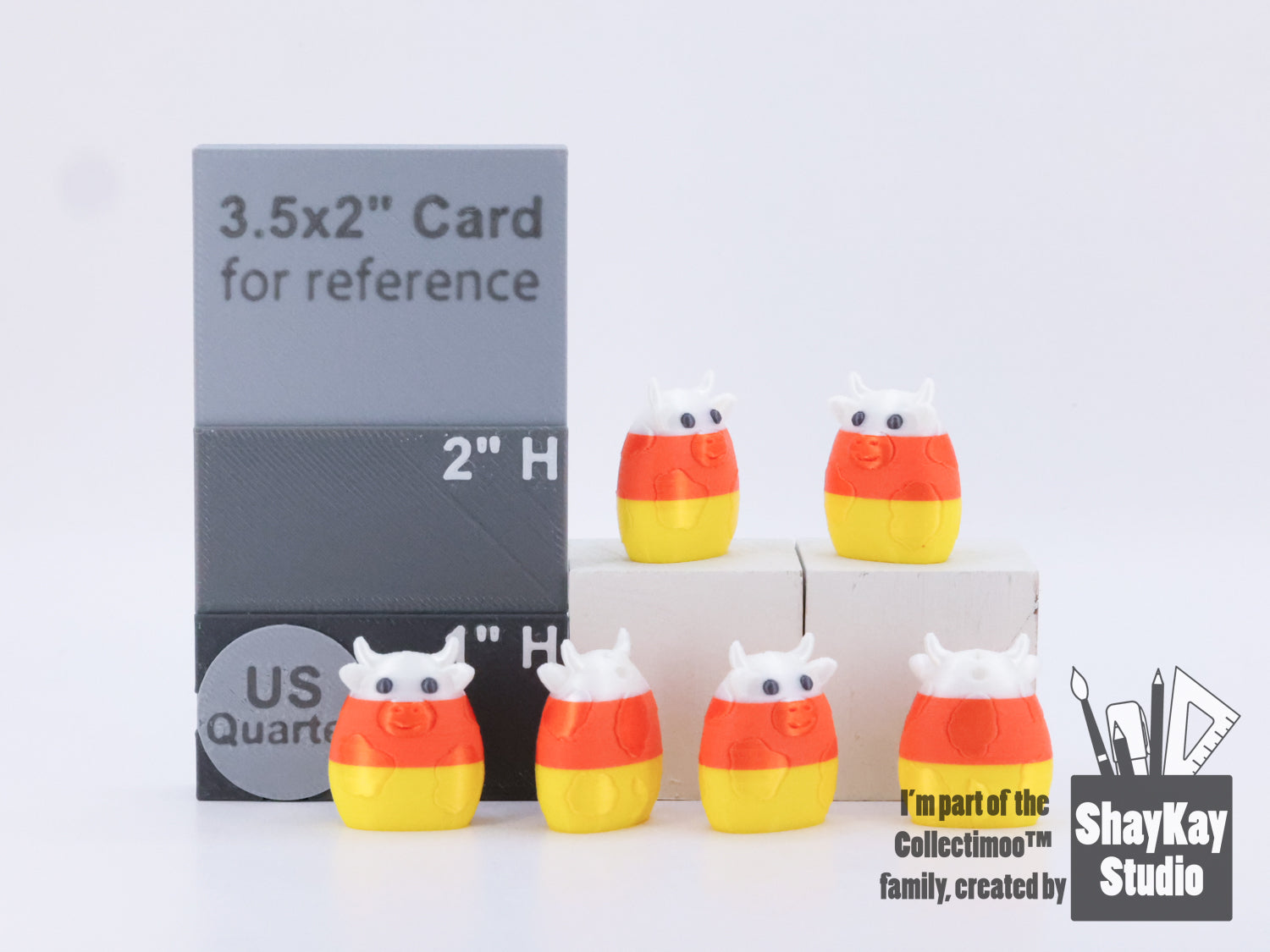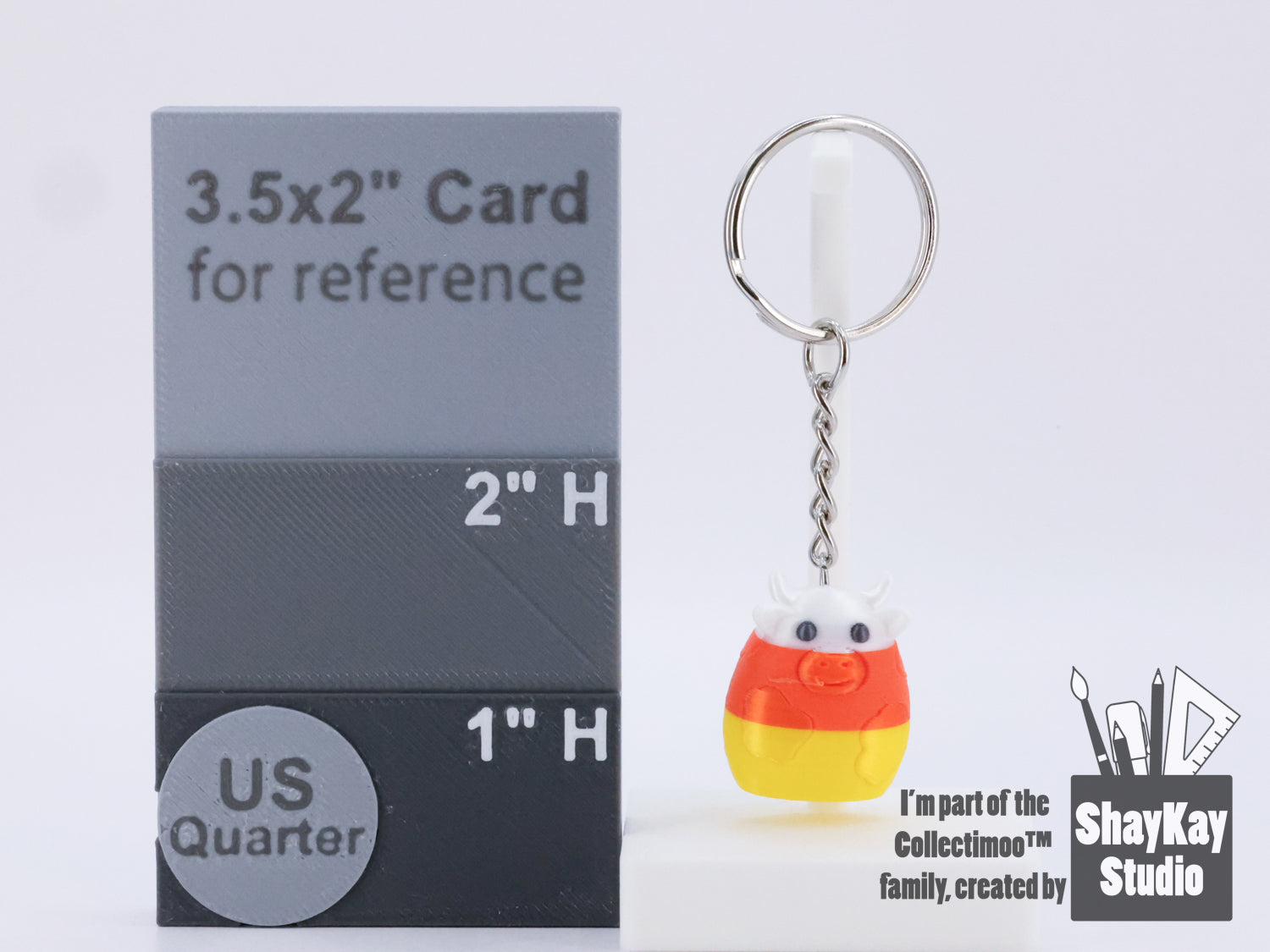 This Micro Candy Corn Moo is part of the Collectimoo® series and can be used as: decorations in vehicles, home decor, game pieces, jewelry and the like, keychains, keyring, promotional trinkets, as figurines, and so much more!