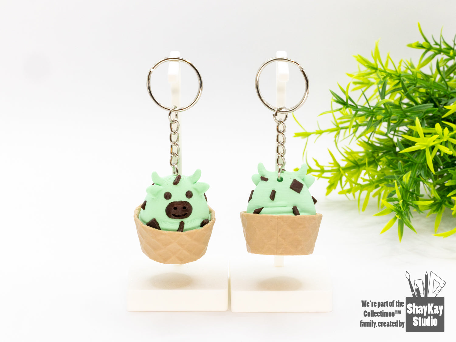 Our Moos measure ~1.58" tall whereas Micro Moos measure 1" tall; both can be ordered as pre-made keychains. What's more, some Micros also are able to be ordered as magnets (aka MOOnetics!)
