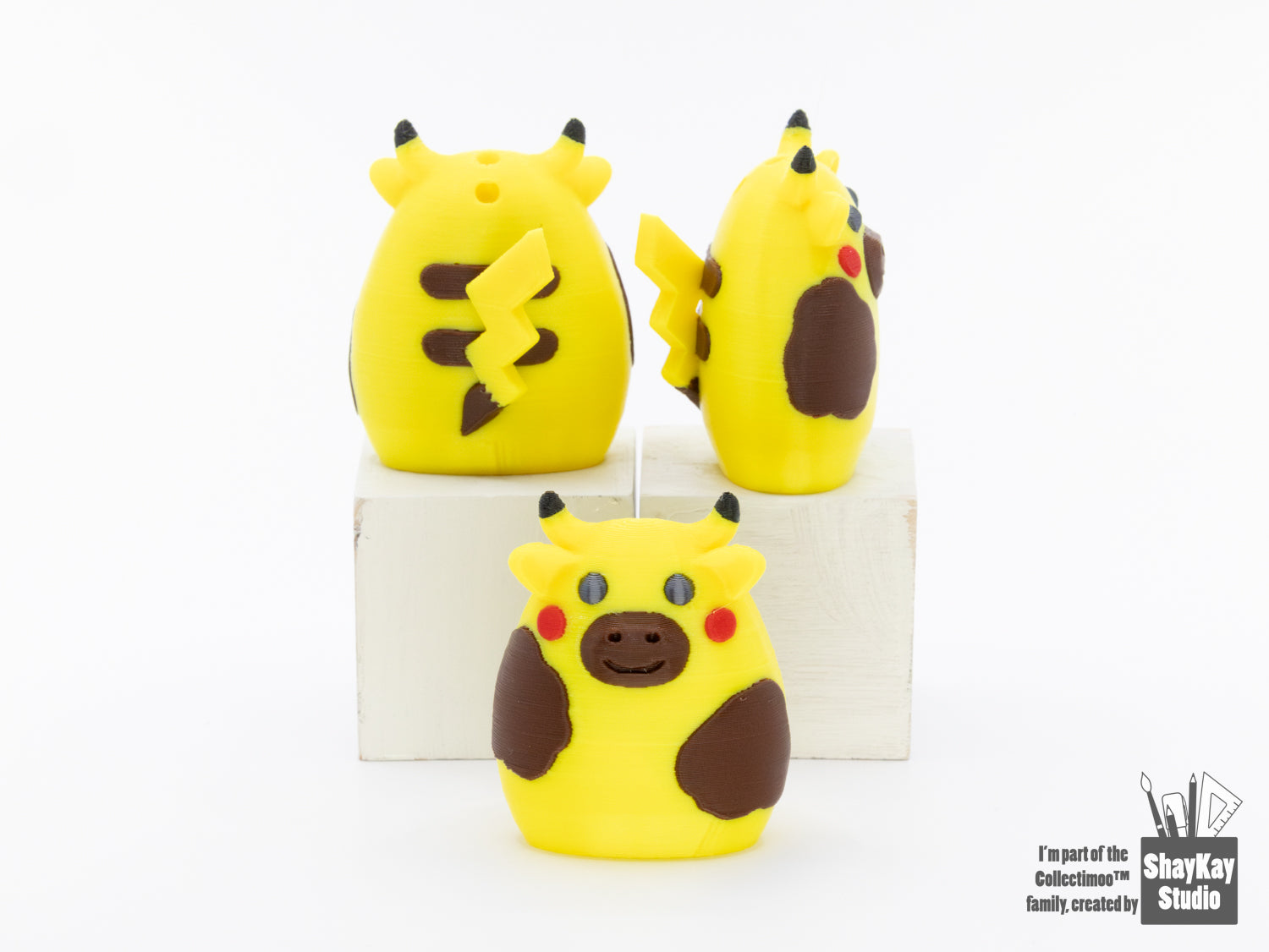 Moochu Moo (Pika Moo) is part of the Collectimoo® series and can be used as: decorations in vehicles, home decor, game pieces, jewelry and the like, keychains, keyrings, promotional trinkets, as (cow) figurines, for Moo Moo Subaru mooing, for Random Acts of Kindness, and so much more!