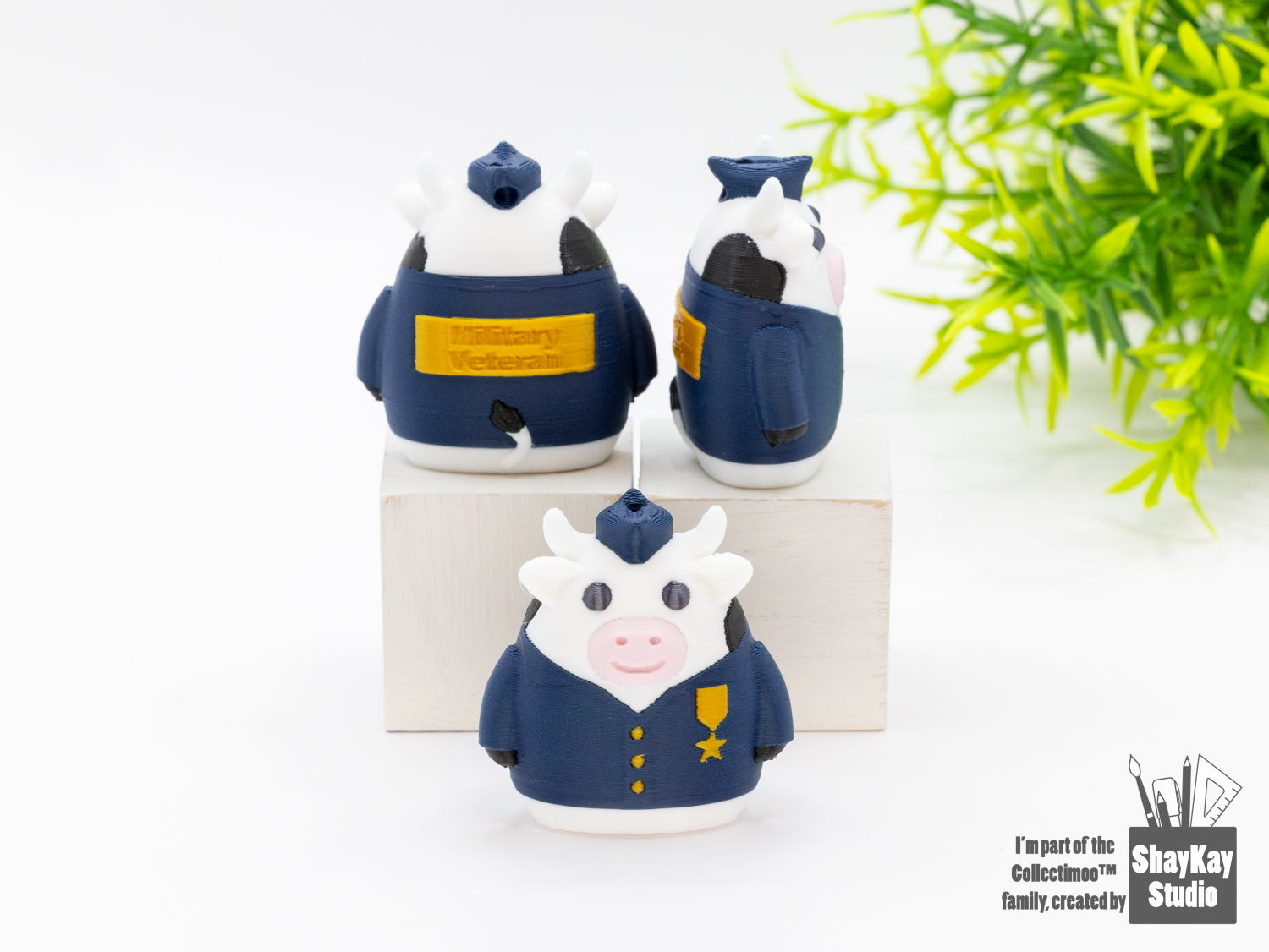 No detail was spared for our custom Navy Military Veteran Moo. From the golden buttons running down the jacket to matching hat, we meticulously modeled each detail to bring this model to life. Even adding hooves that poke out from just below the sleeve cuffs.