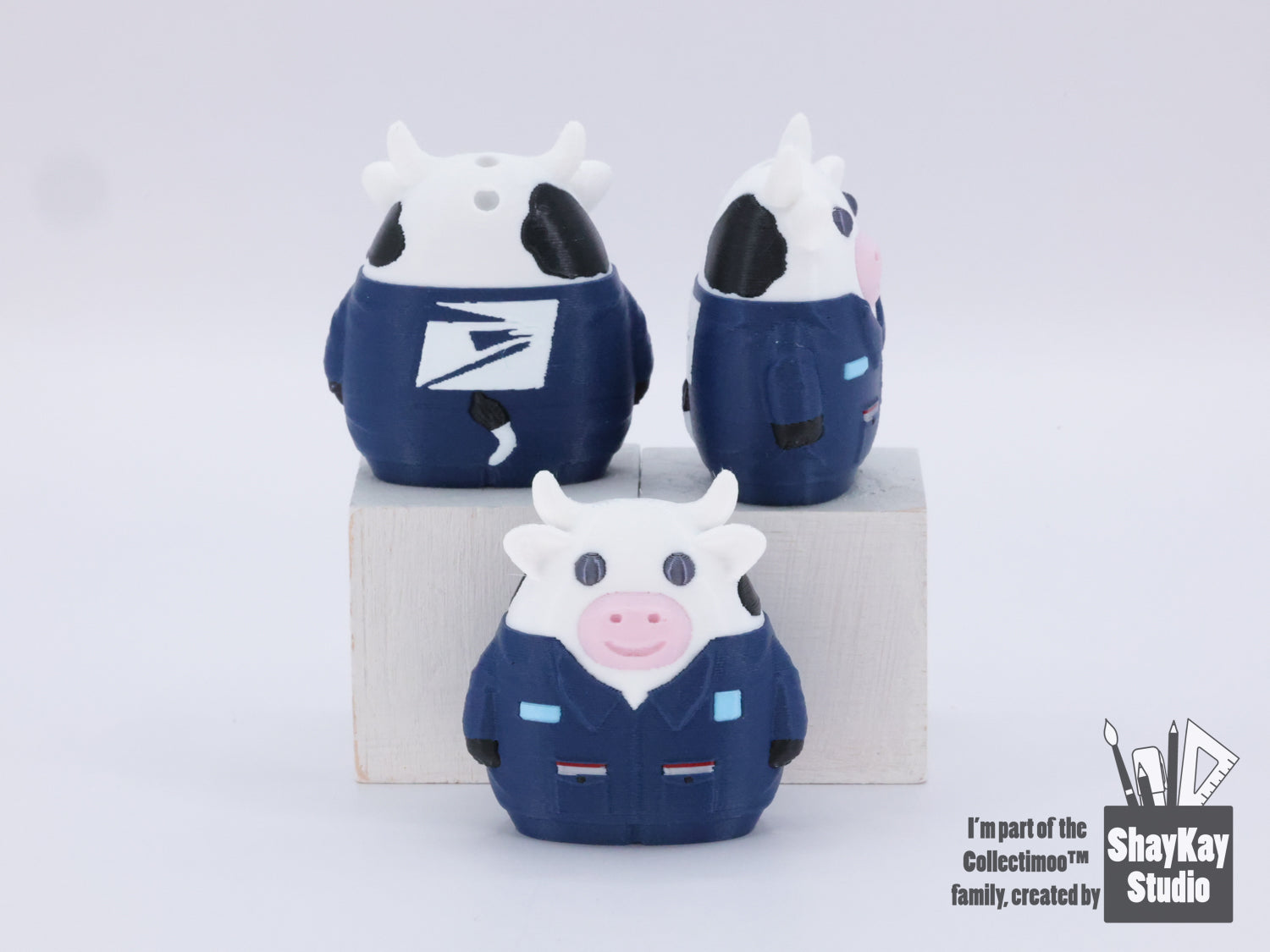Postal (Post Office) Moo is part of the Collectimoo® series and can be used as: decorations in vehicles, home decor, game pieces, jewelry and the like, keychains, keyring, promotional trinkets, as figurines, and so much more!