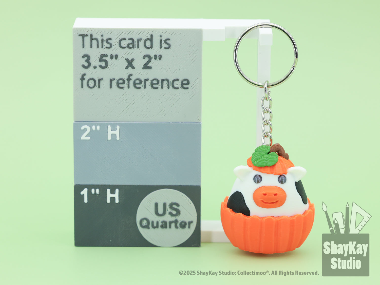 Our Moos measure ~1.58" tall whereas Micro Moos measure 1" tall; both can be ordered as pre-made keychains. What's more, some Micros also are able to be ordered as magnets (aka MOOnetics!)
