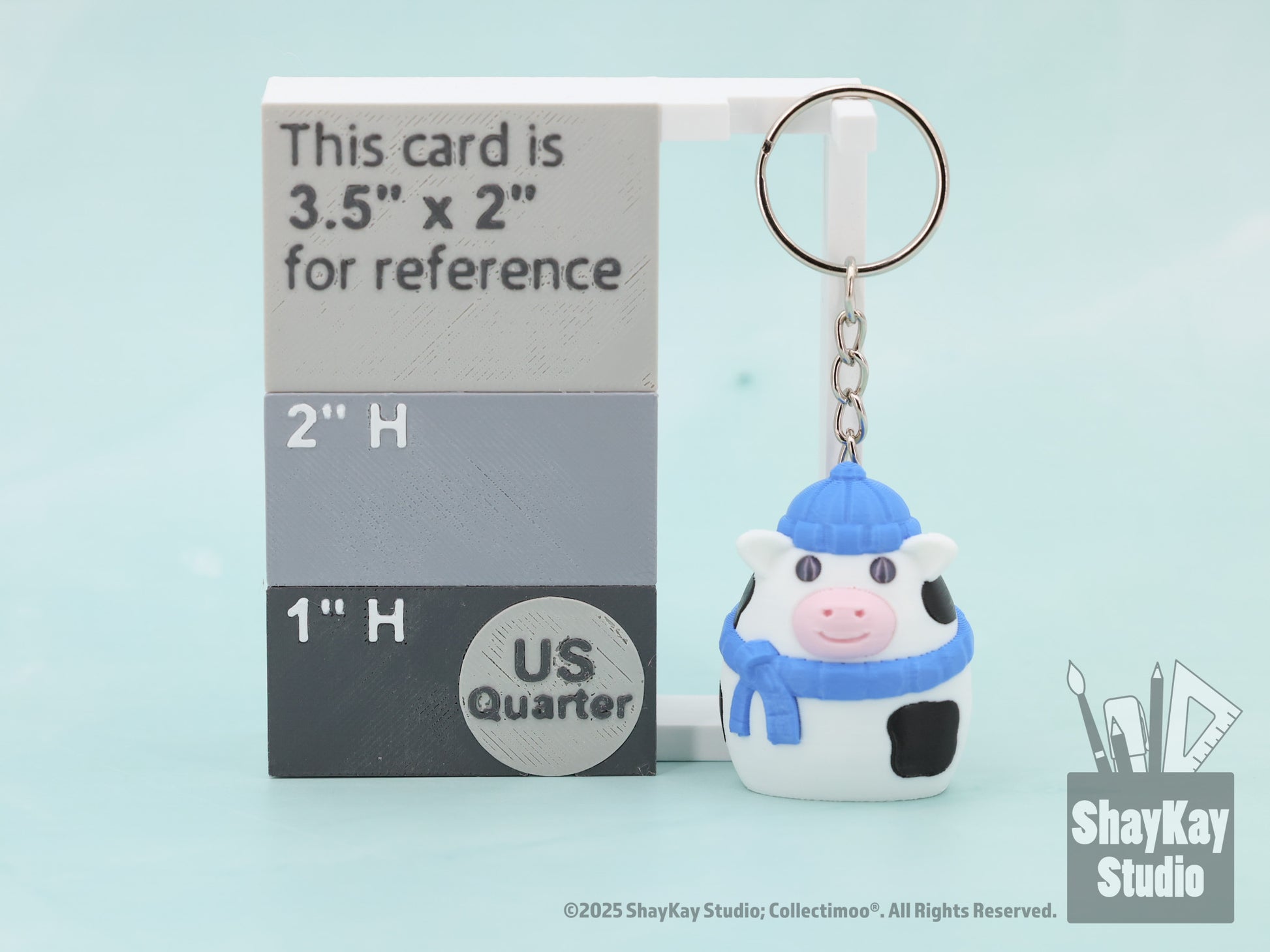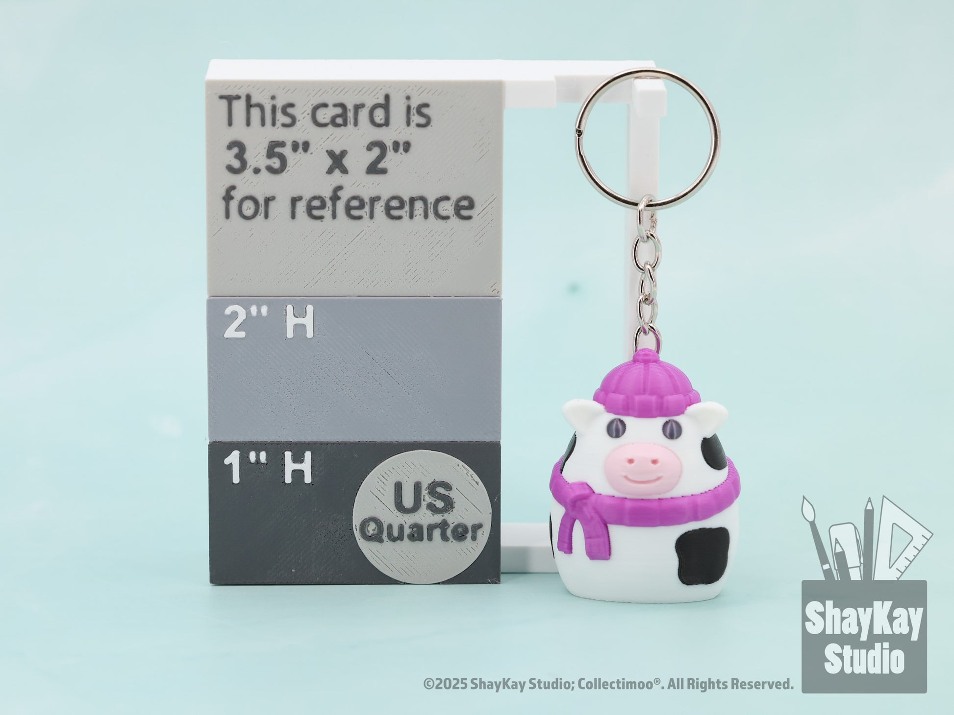 Our Moos measure ~1.58" tall whereas Micro Moos measure 1" tall; both can be ordered as pre-made keychains. What's more, some Micros also are able to be ordered as magnets (aka MOOnetics!)